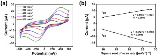 The electrochemical behavior of the AgNWs/HPMC/CS/Urease-modified electrode was evaluated using a standard solution of K3[Fe(CN)6] as a redox couple probe. The CV curves of 5 mM K3[Fe(CN)6]/0.1 KCl were measured at various scan rates ranging from 100 to 800 mV/s by sweeping the potential from −600 to 600 mV in the presence of 20 µM Hg(II) and 2% w/v urea. The results shown in Figure 4a reveal that the redox peak currents are significantly increased, and the peak positions are slightly shifted by increasing the scan rate, implying that the diffusion layer was decreasing []. In addition, a linear relationship between the peak current and the square root of the scan rate was observed, with a correlation coefficient of 0.9806 and 0.9996 for the anodic and cathodic peak currents, respectively (Figure 4b). This indicates that the redox process is diffusion-controlled []. Regarding the Randles–Sevcik equation [], the diffusion coefficient of K3[Fe(CN)6] was calculated to be 2.4 × 10−8 cm2/s. A scan rate of 100 mV/s was chosen to perform the experiments in this work.