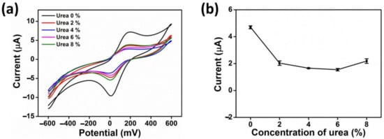 The influence of urea substrate concentration on AgNWs/HPMC/CS/Urease-modified electrode performance in heavy metal sensing applications was evaluated by cyclic voltammograms (CV) using 5 mM K3[Fe(CN)6]/0.1 KCl as a redox probe. The experiments were performed in the presence of 20 µM Hg(II), varying the final concentration of urea (2, 4, 6, and 8% w/v) and scanning from −600 to 600 mV with a scan rate of 100 mV (Figure 5). When the amount of urea as a substrate on the electrode surface increased, the peak current decreased gradually at 2% w/v of urea. With any further increase in the substrate amount, the current showed no further significant decrease. Thus 2% w/v urea was used for further experiments.