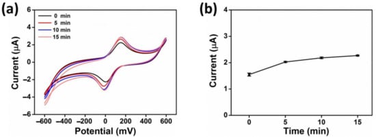 The optimal response time, or incubation time, of the fabricated sensor with samples containing heavy metals is a key performance parameter. Fast sensing is preferable but sufficient time must be allowed for enzyme/heavy metal bonding and inhibition. The experiments were performed using the AgNWs/HPMC/CS/Urease-modified electrode in the presence of 20 µM Hg(II) as the inhibitor, 2% w/v urea, and 5 mM K3[Fe(CN)6/0.1 M KCl as a redox probe. These experiments were performed with the potential scanned from −600 to 600 mV with a scan rate of 100 mVs–1. The inhibition curve illustrated a slight increase in current for the first 10 min; the incubation time was monitored from 5 to 15 min (Figure 6). However, when the electrode was incubated with Hg(II) solution for 15 min, it did not show a further significant increase in the current. Thus, an incubation time of 10 min was used for further experiments.