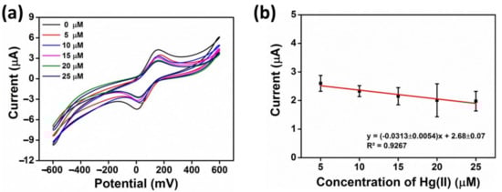In this section, we investigate the AgNWs/HPMC/CS/Urease/SPCE biosensor quantitatively for the detection of Hg(II) ions. The modified electrode was investigated by incubation with various concentrations of Hg(II) ions in deionized water under optimal experimental conditions. The peak current due to ferricyanide was decreased as the concentration of Hg(II) increased, as shown in Figure 7a,b. This is attributed to an increase in the inhibition of free catalytic sites on the urease enzyme, which are available to the substrate. Under these conditions, the peak current decreased linearly with Hg(II) concentration over a linear range of the latter from 5 to 25 µM. A linear equation of Ipa = −(0.0313 ± 0.0054)x + 2.68 ± 0.07 could be fit to the data with a regression coefficient (R2) of 0.9267. The limit of detection (LOD) and limit of quantitation (LOQ) were found to be 3.94 μM (1069 ppb) and 6.50 μM (1765 ppb), respectively (the concentration of Hg(II) required to give the current change equal to 3 standard deviations (3σ; 10 replicate measurements of blank sample (I0) and 10 standard deviations (10σ) of I0 for LOQ).