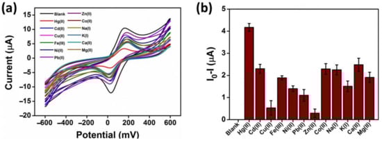 (a) Cyclic voltammogram response of the AgNWs/HPMC/CS/Urease/SPCE in the presence of 20 µM of different metal ions, 2% w/v urea, and 5 mM K3[Fe(CN)6/0.1 M KCl. (b) The different peak current changes of the modified electrode for the data from (a).