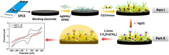 Specifically, we developed a biosensing platform based on a silver nanowire/hydroxypropyl methylcellulose/chitosan/urease (AgNWs/HPMC/CS/Urease) composite modification to a screen-printed carbon electrode (SPCE) and tested it as a Hg(II) biosensor (Scheme 1). The AgNWs/HPMC/CS/Urease layer displays excellent surface conductivity due to the AgNWs, is biodegradable and hydrophilic due the HPMC matrix [], and has high loading of urease enzyme due to the chitosan adhesive agent [], increasing the sensitivity and the stability of the modified electrode. We then tested our biosensor, including on commercial drinking water samples, to verify its sensitivity and practicality for the detection of Hg(II) and other metal ions in real world applications. Under optimum conditions, the modified SPCE biosensor exhibited excellent performance with a linear sensitivity range of 5–25 µM for the detection of Hg(II) ions and limit of detection (LOD) and limit of quantitation (LOQ) of 3.94 µM and 6.50 µM, respectively. The biosensor also exhibited excellent recoveries for the detection of Hg(II) ions in commercial drinking water samples (101.62–105.26%).