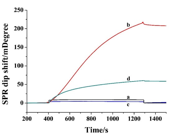 SPR sensorgrams when injecting 0.1 mg/mL SA-IgG to the fluidic channel wherein the NA-covered chip had been treated by blank buffer (curve a) and 20 nM bio-GDEVDGK-bio (curve b). Curves c and d were acquired when injecting 0.1 mg/mL IgG and 0.05 mg/mL SA onto the NA-covered chip treated by bio-GDEVDGK-bio.