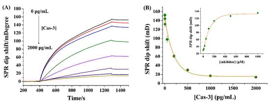As a proof-of-concept experimental for evaluation of Cas-3 activity, the inhibitor DEVD-FMK at different concentrations was incubated with 500 pg/mL Cas-3. The inset in Figure 2B shows the dependence of SPR dip shift on the concentration of inhibitor. The increase in inhibitor concentration induced the enhancement in the SPR signal, indicating that DEVD-FMK is an effective Cas-3 inhibitor. The half-maximal inhibitory concentration (IC50) was estimated to be 98 nM, which is in agreement with that measured by other methods [30,36]. Thus, the method has bright prospects for the screening of protease inhibitors.