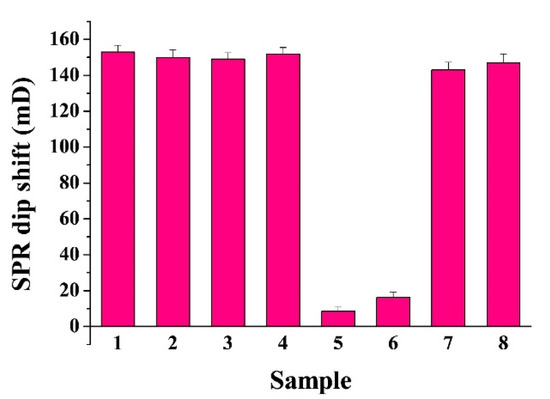 To evaluate the specificity of the method, the method was first challenged by determining other proteases (e.g., thrombin, beta-secretase, and PSA) to replace Cas-3. As shown in Figure 3, the tested proteases did not induce a significant decrease in the SPR dip shift, suggesting that the method shows high selectivity toward Cas-3 (cf. curves 1~4). However, trace biotin or other molecules in real samples may interact with biotin, thereby limiting the practical application of the technique. For this consideration, the interferences from avidin and biotinylated biomolecule such as bio-GLRRASLG were examined. As envisaged, both avidin and bio-GLRRASLG caused a significant decrease in the SPR signal (curves 5~6). The result is understandable as avidin can bind to the peptide substrate (bio-GDEVDGK-bio) and the biotinylated peptide can compete with the substrate to bind NA on the chip surface, thus preventing the attachment of bio-GDEVDGK-bio on the chip. To resolve this problem, a certain amount of biotin was added to the sample in advance to eliminate the interference of avidin. The free biotin or biotinylated peptide was then removed by the commercial SA-modified magnetic beads. As a result, the interferences from avidin and biotinylated peptide have been well eliminated (curves 7~8).