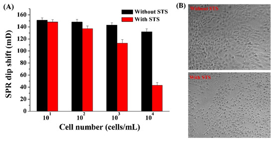(A) Dependence of SPR signal on the concentration of normal and STS-treated HeLa cells. (B) Confocal images of normal and STS-treated HeLa cells.