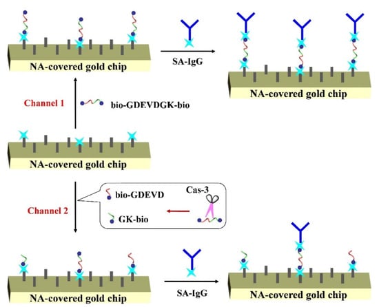Surface plasmon resonance (SPR) is a simple, label-free technology to monitor the protein-protein interactions by measuring the refractive index change at the sensor surface [11,12,13,14]. The technology can be used to monitor the cleavage of protein or peptide fixed on the chip surface, providing a label-free detection method for protease analysis due to the advantages of fast response, real-time detection, high signal-to-noise, and good compatibility with the microfluidic system. For example, Steinrücke and co-workers suggested that cleavage of the helical protein with 78 amino acids by protease caused a detectable SPR signal [15]. However, the cleavage of low molecular weight peptides leads to a small, undetectable change in the refractive index [16,17,18]. Thus, it usually requires a signal amplification strategy to detect protease by labeling the peptide substrate with nanomaterials or specific groups [19,20,21,22,23,24]. Biotin is usually used to label peptide substrate for the design of heterogeneous biosensors. It can interact with avidin or its analogs of neutravidin (NA) and streptavidin (SA) with a binding coefficient as high as ~1015 M−1. Such an interaction allows for the immobilization and recognition of peptide substrate at the solid-liquid interface [25,26,27,28]. By integrating the advantages of homogeneous assays, herein, we proposed a novel SPR method for protease detection by the signal amplification of SA-conjugated immunoglobulin G (SA-IgG). Caspases, a family of cysteine proteases, play an important role in apoptosis. To demonstrate the feasibility of the method, caspase-3 (Cas-3) that can specifically recognize and cleave the C-terminal of the peptide with the DEVD sequence was determined as the model. A peptide labeled with two biotin tags at the N- and C-terminals (bio-GDEVDGK-bio) was used as the substrate (Scheme 1). In the absence of Cas-3, the peptide substrate can be captured by the NA-covered chip through the avidin-biotin interaction (Channel 1). The biotin group at the other end of the peptide allows for the capture of SA-IgG, thus resulting in a strong SPR signal. When the peptide substrate was digested by Cas-3 in the aqueous phase, the biotinylated products (bio-GDEVD and GK-bio) would compete with the substrate to bond NA on the chip surface (Channel 2). This prevents the attachment of bio-GDEVDGK-bio and the follow-up capture of SA-IgG by the avidin-biotin interaction. However, when the activity of Cas-3 was suppressed by inhibitor, more bio-GDEVDGK-bio substrates would be anchored on the chip surface, which facilitating the capture of SA-IgG. The method was used to evaluate the inhibition efficiency of the inhibitor and monitor the activity of Cas-3 in cell lysates.