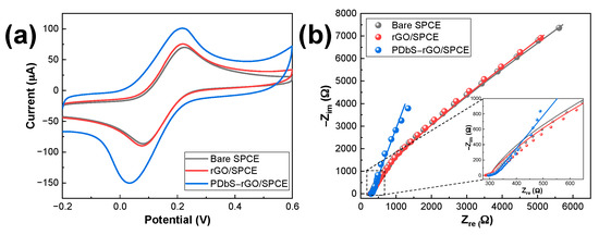 The electrochemical behavior of the electrodes (bare SPCE, rGO/SPCE, and PDbS−rGO/SPCE) was characterized by CV and EIS using K3[Fe(CN)6] as a model redox probe. Figure 2a shows the cyclic voltammograms measured in a 5 mM K3[Fe(CN)6] solution containing a 0.1 M KCl supporting electrolyte at a sweep rate of 50 mV s−1. All electrodes exhibited well-defined oxidation and reduction peaks. The peak potential separation (ΔEp) for bare SPCE, rGO/SPCE, and PDbS−rGO/SPCE was 127, 128, and 172 mV, respectively. These values of ΔEp are greater than 57/n mV (n = number of electrons), the actual value for the reversible electron transfer reaction [27]. The current ratio between the anodic and cathodic peaks (ipa/ipc) for bare SPCE, rGO/SPCE, and PDbS−rGO/SPCE were 0.82, 0.85, and 0.67, respectively, which was less than 1, indicating quasi-reversible behavior. Therefore, all these characteristics suggest that the Fe2+/Fe3+ redox couple on the electrodes exhibits quasi-reversible behavior. In addition, the CV measurements were repeated at other scan rates (10–200 mV s−1) to investigate the electrochemical active surface area (ECSA) of the electrodes. Using the Randles–Ševčík Equation (1) and assuming a temperature of 25 °C [28]