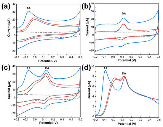 CV curves measured in (a) 500 µM AA; (b) 50 µM DA; (c) the mixture of 500 µM AA and 50 µM DA with bare SPCE (black line), rGO/SPCE (red line), and PDbS–rGO/SPCE (blue line). CV curves for bare SPCE measured in 50 mM PBS (pH 7.0) are represented as black dash–dot lines. Scan rate: 50 mV s−1; (d) LSV curves measured in a mixture of 500 µM AA and 50 µM DA for bare SPCE (black line), rGO/SPCE (red line), and PDbS–rGO/SPCE (blue line) at a scan rate of 10 mV s−1.