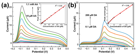 The electrochemical oxidation behaviors of DA and AA on PDbS−rGO/SPCE were examined individually by LSV, and the results are shown in Figure 4. ipa increased substantially as the DA and AA concentrations increased. In the AA concentration range from 10 µM to 1.1 mM, a sensitivity of 153.9 µA mM−1 cm−2 was achieved. Similarly, linear responses were observed for DA in two concentration ranges: from 100 nM to 50 µM (sensitivity: 578.3 µA mM−1 cm−2) and from 50 µM to 200 µM (sensitivity: 402.9 µA mM−1 cm−2).