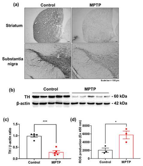 (a) Immunohistochemistry stained with TH antibody reveals that TH immunoreactivity clearly reduced by MPTP impaired the nigrostriatal pathway in both STR and SN. Scale bar = 100 µm; (b) Western blot analysis showing that TH levels in the STR region are lower in the MPTP-treated group than in controls; (c) Densitometric analysis of TH levels in the STR (control in black and MPTP in red color); (d) Level of reactive oxygen species (ROS) measured using DCF-DA, showing significantly elevated ROS production and increased oxidative stress in MPTP-treated STR. The results are presented as mean ± SE (n = 3–5 mice/group). * p < 0.05, *** p < 0.001 vs. naïve controls. The analysis was conducted by unpaired t-test with Fisher’s PLSD procedure (control in black and MPTP in red color).