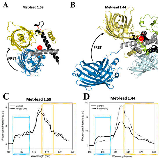 Since crystallography images of PbrR (the key to Pb sensing of Met-leads) are currently unavailable, the current structural knowledge of Met-leads relies on molecular simulation, which still needs to be confirmed. Fortunately, PbrR belongs to the MerR superfamily, and the structures of some MerR members have been resolved by crystallography, e.g., MerR [33]. Homology modeling has been used to display the structures of PbrR [23] and Met-leads (Figure 1A,B) [23,26] using structural information about MerR as a reference [33]. The distance between the donor and acceptor inside Met-lead 1.44 appears to be farther than that inside Met-lead 1.59. Perhaps there is more space between FRET pair proteins inside Met-lead 1.44 compared to Met-lead 1.59, thus generating various types of flexible conformations for FRET and producing wider ranges of FRET ratio values. This could explain why Met-lead 1.44 has higher dynamic ranges and sensitivity. Furthermore, the linker version of Met-lead (1.44 M1) could generate additional space between FRET pair proteins (lower ratio value at resting [23]). Whether this difference in distance is the main reason for the higher FRET efficiency of Met-lead 1.44/1.44 M1 than Met-lead 1.59 remains to be verified using solid crystallography data in the future.