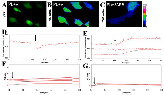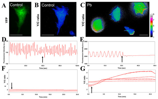 The simultaneous recording of the physiological activity and entry of Pb into iPSC-derived cardiomyocytes. (A–C), The acceptor (YFP) image (A) and the FRET Y/C ratio images (B,C) of cells expressing Met-lead 1.44 M1 were acquired in control buffer (A,B) or after Pb treatment (50 μM; (C)). The color bar for B and C represents Y/C ratio values from 1 to 9. The scale bars are 40 μm. (D,E), Within the 25-min recordings, the time-lapse fluctuation of fluorescence signals in the tested cells revealed the beating activity (control in (D); Pb in (E)). (F,G), Simultaneously, intracellular Pb sensing (Y/C ratio increase) could be observed in control (F) and Pb (G) treatments. Buffer without (Control) or with Pb (Pb) was introduced at the time points indicated by arrows.