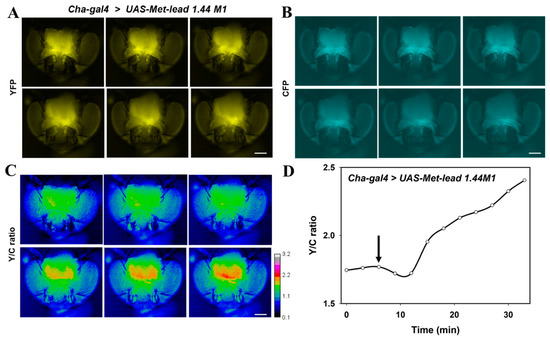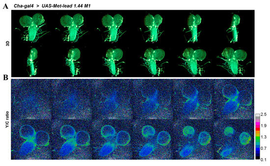 The impact of Pb on the nervous system has been noted for years [10,12]. In this study, we introduced the improved Met-lead 1.44 M1 (Figure 1B) biosensor gene into Drosophila with tissue-specific expression of the upstream activating sequence controlling the gene’s expression (UAS-GAL4 flies). In this way, the performance of the Pb biosensor within targeted organs at different life stages, such as the adult brain (Figure 4) or larval CNS (Figure 5), could be detected. In adult flies that expressed the Pb biosensor within cholinergic neurons (Cha-gal4 > UAS-Met-lead 1.44 M1, Figure 4A,B), changes in the FRET ratio signal within the neurons of the brain were visualized as rainbow-colored images (Figure 4C) or were displayed as line plots for selected regions (Figure 4D). These increased FRET ratio signals not only represent the presence of Pb in situ (Figure 4C,D) but also provide a direct demonstration that the Pb biosensor can be used to detect the Pb content within living organisms. We further applied a two-photon FRET platform to show the single-cell image quality of the intact adult fly brain ex vivo (Figure S5 and related animations in 3D or optical sections) and even in vivo alive (Figure S6 and related animations in 3D or optical sections).