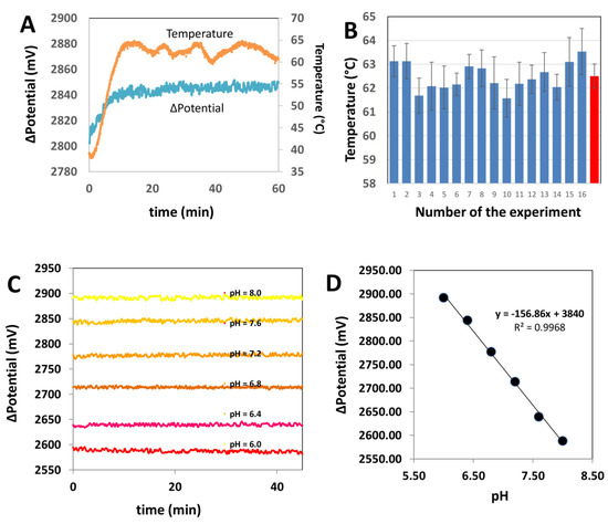 Basic characterization of the electric potential monitoring system and the Arduino-based proportional–integral–derivative (PID) controller. (A) The potential differential is stable at isothermal conditions. The evolution of the potential differential is marked in blue. Temperature is marked in orange. (B) The Arduino-based PID controller is able to maintain the temperature value around the set point value (62.5 ± 0.5 °C) in a set of 16 independent experiments indicated with blue bars. The red bar indicates the average temperature and standard deviations of this set of 16 independent experiments. (C) The potential signal is stable at different pH values in the range of 6.0 to 8.0. (D) A linear dependence between pH and potential differential was observed in the entire range of pH values relevant to the Loop-mediated Isothermal Amplification (LAMP) reaction.