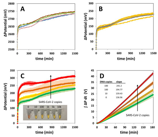 Figure 4C shows the trajectories of the electric potential associated with positive samples containing different quantities of SARS-CoV-2 synthetic genetic material (color curves; i.e., in the range of 10 to 1000 copies of the N gene of SARS-CoV-2).