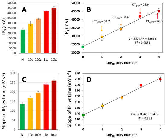 Results from the online evaluation of electric potential in five saliva samples from volunteers diagnosed as SARS-CoV-2 negative (green symbols) and a sets of five saliva samples added with 10 (yellow), 100 (orange), 1000 (red), and 10,000 copies (burgundy symbols) of SARS-CoV-2 genetic material. (A) Value of the integral of the differential of potential with respect to time for the first 3 min of amplification (defined here as IP3 value) in saliva samples containing different copy numbers of synthetic SARS-CoV-2 genetic material in the range of 10–10,000 copies (yellow, orange, red, and burgundy bars) or not containing SARS-CoV-2 genetic material (green bar). (B) A correlation exists between the number of synthetic N gene copies of SARS-CoV-2 in the sample and the IP3 value. The corresponding cycle threshold (CT) values, as determined by qPCR, are indicated with arrows. (C) Value of the slope of the plot of IP3 versus time for the same set of samples; (D) a correlation also exists between the slope of the IP3 time plot and the gene copy number in the sample. In all cases, data from at least four independent runs were analyzed. Error bars indicate standard deviations.
