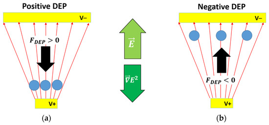 Particles’ interaction in a non-uniform applied field: (a) the DEP force is positive, i.e., collinear to the electric field gradient ∇E², and the particles are attracted to areas of high field intensity (positive DEP); (b) the DEP force is negative, i.e., opposite to the electric field gradient ∇E², and the particles are repelled toward areas of low field intensity (negative DEP).