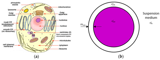 In order to predict cells’ behavior with an applied electric field, it is helpful to have a simplified model of a biological cell. The Figure 2 presents a schematic of a cell and its commonly used associated single-shell model associated where the cell membrane and cytoplasm are represented by a shell and a core with their own complex permittivity [8,9,10].