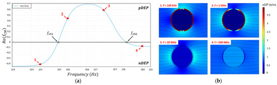 Figure 3 illustrates the frequency-dependent cell behavior through the real part of the CM factor (Figure 3a). The dielectric parameters and cell geometric parameters are reported in Table 1. The real part plot in Figure 3a is computed thanks to the myDEP software [11]. nDEP behavior can be observed at very low frequency (lower than 400 kHz) and at high frequency (at least higher than 150 MHz), and pDEP behavior can be seen at medium range frequency (between 500 kHz and 100 MHz). The plot of the CM factor hence presents alternations between a repulsive state (nDEP) and an attractive state (pDEP). Two crossover frequencies fx01 and fx02 appear where the real part of the CM factor becomes null. fx01 occurs at low frequency, whereas fx02 occurs at higher frequency.