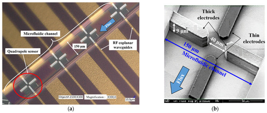 (a) Quadrupole microelectrodes sensor implemented with a microfluidic channel in BiCMOS; (b) Scanning Electron Microscopy (SEM) picture of a quadrupole sensor.