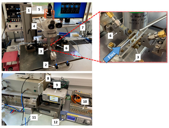 Experimental bench where the crossover frequencies measurements are performed. The labeled parts refer to: (1) external flow controllers Elveflow OB1; (2) cell suspension; (3) UHF-DEP microfluidic chip, a zoomed picture is shown in the red dotted box; (4) Scope.A1 Zeiss Microscope; (5) camera Axiocam 105 color Zeiss; (6) RF probes MPI TITAN T26P-GSG-150; (7) power divider; (8) power amplifier Bonn Elecktrik BLWA 100-5M; (9) power meter Anritsu ML2496A; (10) attenuator/switch driver 11713A HP; (11) low-frequency generator Agilent 33250A; (12) RF signal generator SMB 100A from Rhode & Schwarz.