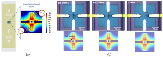 Principle of the crossover frequency measurement: (a) schematic of the microfluidic chip with a zoom in on one quadrupole sensor. Computation of the biased sensor in a non-uniform electric field (COMSOL Multiphysics®). The scale color corresponds to the normalized electromagnetic field intensity; (b) dielectrophoretic response of a single U87-MG NM cell under an UHF applied signal for frequencies between 220 and 169 MHz. The second crossover frequency fx02 is measured at 169 MHz.