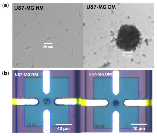 In order to enrich the tumor cell populations in undifferentiated cells related to CSC, U87-MG cells were cultured in Define Medium for 5 days. Morphological changes are observed macroscopically in these stringent culture conditions. As expected, the morphology of U87-MG NM vs. U87-MG DM is completely different (Figure 7a). In Normal Medium, cells are spread out in the petri dish, whereas in Define Medium, cells develop the ability to form glioma spheres due to the presence of specific growth factors (EGF and bFGF-2). It is known that neural stem cells cultured in vitro have the capability to generate clonal structures called “neurospheres” [26]. Glioma spheres are composed of a wealth of aggregated cells. However, just before the DEP characterization, cells are resuspended in the DEP medium and glioma spheres are mechanically broken with the action of a micropipette. When the cell suspension is injected in the lab-on-a-chip, the cells cultured in different conditions present a round shape, and no significant difference in morphology can be observed under an optical microscope (Figure 7b).