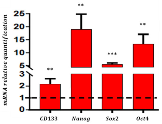 To confirm the enrichment of cancer stem cells from total cell population, we achieved a transcriptomic analysis in order to assess the changes of mRNA expression levels related to CSC biomarkers (CD133, Nanog, Sox2 and Oct4) when U87-MG cells were cultured either in the Normal Medium or in define medium. mRNA relative quantification of U87-MG cultured in Define Medium were normalized, respectively, to the gene expression of U87-MG culture in the Normal Medium (dotted line) (Figure 8). As expected, CSC transcripts were overexpressed in define medium cultured cells, confirming the enrichment of CSCs in cell subpopulation.
