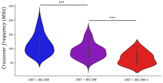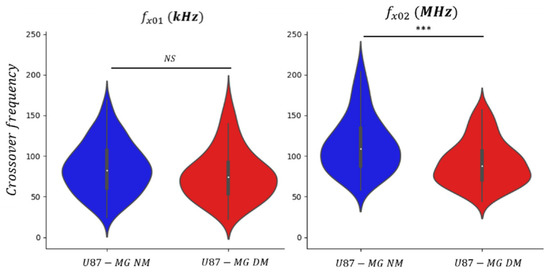 A representative number of cells have been individually characterized to statistically consolidate the collected dataset and make the established signatures significant. One can notice that the distribution of the first crossover frequency fx01 is mostly the same for the two culture conditions, NM vs. DM. The median value of fx01 for the undifferentiated enriched population (DM) shows no significant difference with the normal conditions: 74 and 82 kHz, respectively. Indeed, as shown previously in Figure 8, both U87-MG NM and U87-MG DM present the same round shape morphology. In contrast, the distribution of the second crossover frequency fx02 exhibits a significant difference despite an overlap in frequency. This can be explained by the fact that GBM cell population cultured in normal conditions include a majority of differentiated cells but also few undifferentiated cells. However, for the DM conditions, there are more undifferentiated cells, since presenting stringent survival conditions, DM is more selective. Thus, we can observe a decrease in the crossover frequency fx02 with the presence of the DM cell pool. The median values for U87-MG NM and U87-MG DM are, respectively, 109 and 88 MHz. The decrease in fx02 shows a significant difference between the two cells’ phenotypes, as the p-value is lower than 10−3.