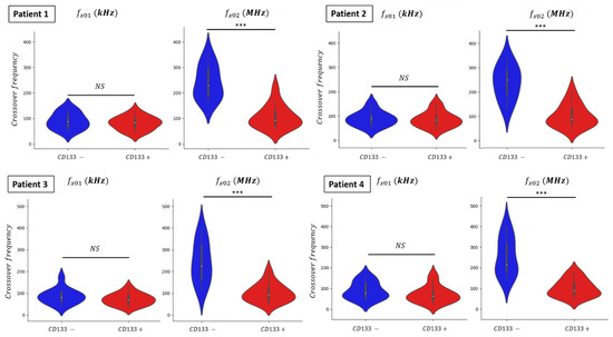 Before DEP characterizations, the GBM cell population was first separated into two subpopulations: CD133− and CD133+. CD133 is a transmembrane protein expressed in human hematopoietic stem cells and progenitor cells [28]. As said before, CD133 is a biomarker associated with stem-like cells, and thus with tumor regeneration. It is possible to mark cells with monoclonal antibodies anti-AC133 coupled with a fluorochrome to detect the presence of the peptide CD133 on the cell surface [29]. Nevertheless, CD133 can be also expressed in differentiated cancer cells, so the whole cell population will present a fluorescent intensity gradient [30]. Hence, we impose a threshold of the fluorescent intensity during the passage of cells in the flow cytometer to define two subpopulations. The CD133+ population is the cell population that overexpresses the marker and thus is enriched in CSCs, while the CD133− population is the population of differentiated cells [28]. Therefore, we separate and isolate the CSC cell population from the differentiated one thanks to a fluorescent marker, before DEP characterizations of these populations. The results of the measured crossover frequencies fx01 and fx02 for both populations are presented in the violin plot (Figure 11).