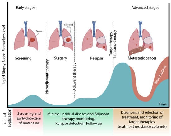 Different stages of lung cancer and clinical application of liquid biopsy. This figure shows the different stages of lung cancer. After surgery, the presence of MRD induces a recurrence. Immunotherapy or target therapy is recommended for treatment and management of relapse. Biosensors are functional for early detection at the screening stage besides identifying new mutants in the advanced cancer stage. Future aspects of biosensors are the assistance of select comprehensive therapy (adjuvant therapy) and monitoring lung cancer at different levels.