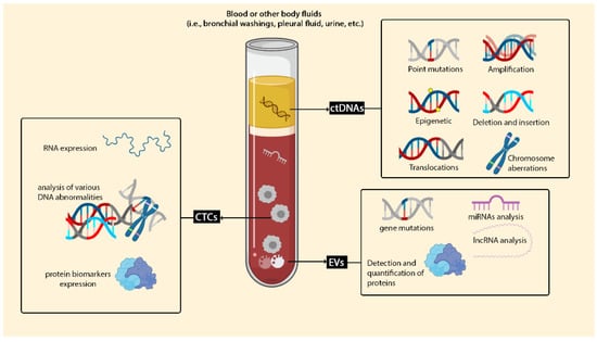 Liquid biopsy in lung cancer. Liquid biopsy can be considered for plenty of clinical targets. Liquid biopsy biomarkers are categorised into three main groups: circulating free DNA (cfDNA), CTCs and EVs. cDNA can be used for detecting a wide variety of mutations, such as insertions, deletions and amplification. Capturing and identifying CTCs in whole blood are cooperative for checking proteins and RNA expression and analysing various DNA abnormalities.