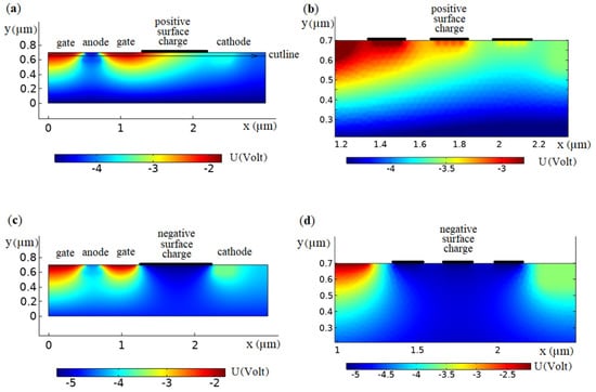 A stationary study type was applied, where the variables used were the electric potential V, electron N, and the hole P concentration. Dealing with this set of variables was sufficient for this study’s task, where the potential and the electric field as well as the electron and hole concentration distributions were studied. Figure 2a–d show the calculated COMSOL 2D distribution of potential inside the model device, with different charges immobilized on the surface between gate and cathode.