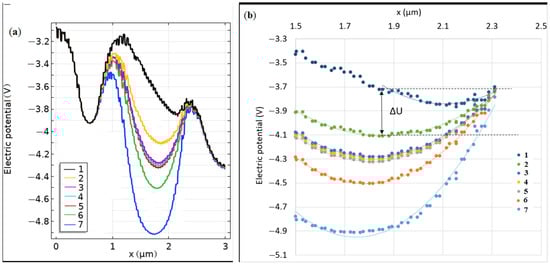 Electric potential distribution at different surface charge density values on two scales on the X-axis. The cutline Y = 0.5 μm, Uct = 0.5 V, Uan = 1 V, Ug = 3 V. The target is GaAs, p-type, the dopant concentration equal p = 1012 cm−3. Barrier −height ΔU was determined for each curve between the cathode potential and the minimum potential (shown for curve number 2). Surface charge values are shown in Table 1 below.