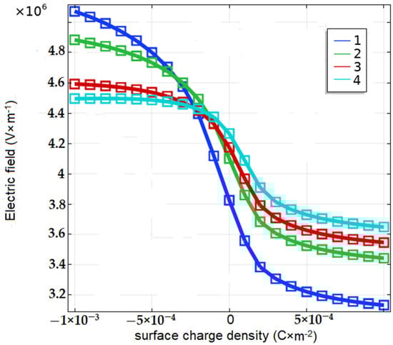 Further, it was calculated by means of the potential approximation function that the electric field has a steep dependence on the surface charge density for absolute minimum values of less than 5 × 10−4 C∙m−2, which determined the high sensitivity of the device as a sensor. Such dependencies were obtained at different levels of doping in a wide range (Figure 5).