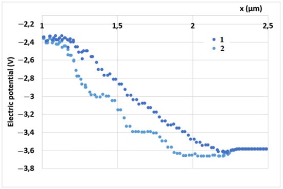 The electric −5 × 10−14 field near the surface reached high values in the order of 104 V∙cm−1 (see Figure 5). Such a field acts not only perpendicular to the surface but also along it. In a strong electric field, an ensemble of charged particles can be separated spontaneously along the surface into separate islands. Apart from the transverse field, a strong lateral electric field appears between the islands in the longitudinal direction along the surface.