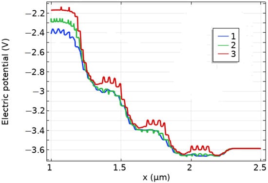 Electric potential distribution. Different cutlines: (1) Y = 0.65 μm, (2) Y = 0.665 μm, (3) Y = 0.685 μm (located closely to the surface Y = 0.700 μm). GaAs, p-type, p = 1012 cm−3. Three surface charge segments = 3. Uct = 0.5 V, Uan = 1 V, Ug = 3 V. Surface charge density ρ = 10−3 .