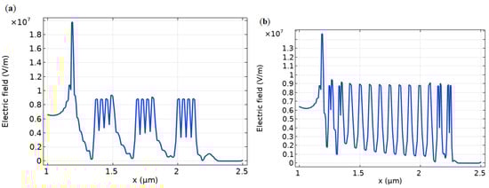 Electric field with charged islands on the surface. The number of charged islands is 3 pieces (a), and 14 pieces (b). Uct = 0.5 V, Uan = 1 V, Ug = 3 V. Cutline Y = 0.70 μm. GaAs, p-type, p = 1012 cm−3. Surface charge density ρ = 10−3 is situated at each island.