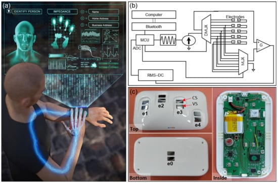 In order to exploit the features of these different parts of the body, it is necessary to devise methods to form electrode contacts and arrange effective electrical paths. A promising strategy for collecting signals in different body parts is using wearable devices []. Existing product types of wearable devices span across smart watches, smart bracelets, smartphones, smart glasses, tablets and PCs. With diverse form factors of wearables and mobiles, identity recognition becomes increasingly significant to provide personalized services of Internet of Things (IoT) devices which provide convenience and accessibility to people’s lives []. Security becomes increasingly important with the use of a large number of IoT devices that require interaction between smart devices and consumers. Biometrics provide improvements in the usability and security of IoT and can play an important role in securing emerging IoT devices to address security challenges. For example, a wearable biometric authentication device through integration with a smartphone-based network substantially expands the range of service applications []. Implementing biometrics in a wearable device has also been shown to increase the collectability and convenience for practical biometric systems [,,,]. These wearable devices have the advantage of being lightweight, portable, and easy to use; however, signal distortions and artifacts are a challenge to be overcome. In comparison to standalone immobile systems, biometric sensing in mobile and wearable devices undergoes large variation in user behavior and changes in environmental factors [], which can cause motion/skin–electrode artifacts. Therefore, researchers have been conducting extensive studies to reduce these artifacts in wearable measurement devices [,]. For instance, researchers have examined how the skin–electrode interface in wearables contributes to the signal noises for electrodes []. However, previous studies mainly focused on the skin–electrode contact interfaces, but few have shown a method to overcome changes in the relative position of the electrode and the skin. Motion artifacts as well as inconsistent placement of the hands and fingers often arise from the interface due to the relative motion of electrodes to the skin, which ultimately limit the repeatability and inevitably affect the performance []. Thus, despite the wearable form factors applied to various body parts widening the opportunities of bioimpedance-based identity recognition, they need to address challenges resulting from uncontrollable harsh operating conditions and large variability.