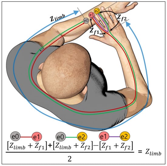 Principle of peripheral variation removal. The pure upper limb impedance can be obtained by subtracting the impedance of a pair of fingers (e.g., (e1, e2)) from the sum of the impedances from electrode e0 (e.g., (e0, e1) + (e0, e2)).