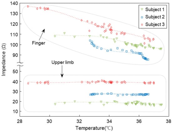 As explained above for the low reproducibility of biological impedance, our body impedance varies greatly depending on external environmental factors, such as temperature, and these effects can vary dependent on the region of the body []. The core temperature is relatively homogeneous throughout the trunk, while the temperature of peripheral tissues, such as the hands or fingers, varies greatly with environmental factors and thermoregulatory vasomotion []. For those reasons, we examined and compared the effect of external temperature changes on the impedance of upper limbs and fingers. We conducted tests in three healthy adults in a temperature-controlled laboratory. Room temperature was controlled in the range of 32.0~18.0 °C, and the test was performed while cooling from a high temperature to a low temperature. The temperature of the body was measured for each test, and the hand temperature changed as the room temperature decreased, and the armpit temperature was constant in the range of 36.8~37.2 °C. To examine the impedance changes with temperature, we used the average of all impedance values obtained over the frequency range of 20 kHz to 500 kHz. The finger impedance of the three subjects was inversely proportional to the measured hand temperature, as shown in Figure 3, whereas the upper limb impedance features extracted from the same experiment stayed constant with environmental temperature changes. These results indicate that changes in external temperature are an important factor influencing impedance measurements, and that upper limb impedance is relatively robust to these changes and can be used as a feature to improve reproducibility.