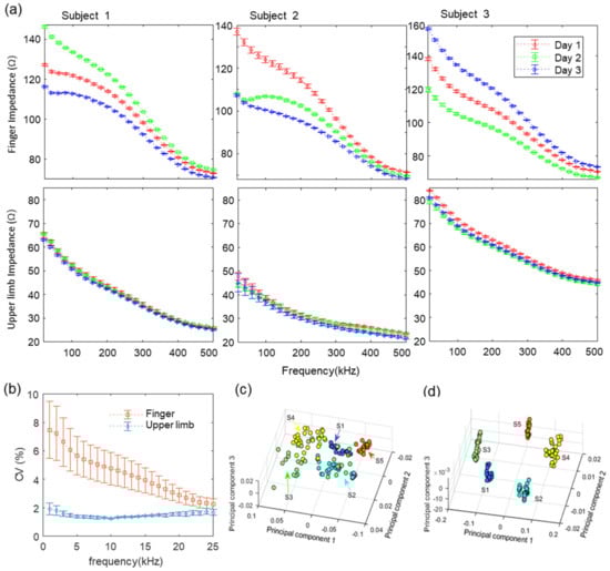 Comparison of temporal variation in finger and upper limb impedance features. The impedance of fingers and upper limbs were obtained over three independent days. (a) Finger (above) and upper limb (below) impedances of three representative subjects measured over three independent days for assessing temporal variation. The error bars in the figure indicate the relative standard deviation (n = 10). (b) Coefficients of variation of finger impedance and upper limb impedance. (c) Scatter plot of the first three principal components of the finger impedance from principal component analysis. (d) Scatter plot of the first three principal components of the upper limb impedance from principal component analysis.