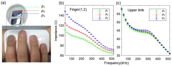 Most of the undesired artifacts by misplacement are associated with the skin contact position with the electrode, resulting in changes in the electrical path, but these effects can be eliminated, especially in the upper limb feature. Note that we removed the contact resistance between skin and electrode by using four-point measurement, as described in our previous work []. Despite the fact that eliminating contact resistance helps to improve robustness against changes in the finger contact condition, the finger contact changes can still alter the electrical path between two measurement points. To examine this effect, we observed the variation in finger impedance by changing index finger placement positions (P1~P3) with respect to the electrode, as shown in Figure 5a, and compared this with the upper limb impedance. The data were measured 10 times per position and displayed as mean and standard deviation. The measured data for the three extreme placement position variations (P1~P3) showed significant finger impedance variation, as shown in Figure 5b. We speculate that the variability of finger placement positions caused changes in the length of current flow and the position of voltage sensing in the electrical path. In addition, the contact area between the finger and electrode varies depending on the finger placement position, which changes the electrical path. Even in the case of the ratiometric method proposed to improve reproducibility in our previous work [], it is vulnerable to signal distortion due to measurement position changes.