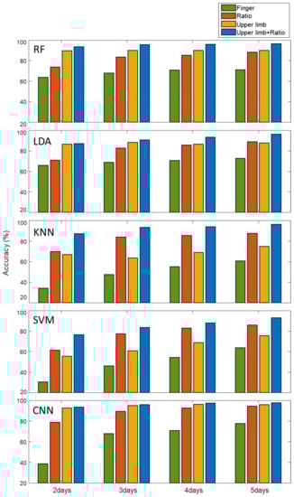 To develop a predictive model that makes accurate predictions on new data, unseen during training, we needed a sophisticated technique, which carefully constructed a training dataset that models were training on, as well as a test dataset without any data leakage from the training dataset [,]. Since biological impedance can vary from day to day due to physiological state changes, the data measured on the same day from one subject tend to be more similar than data measured on the other days. Therefore, if data collected on the same date are present in both the train and test datasets, it is prone to data leakage and overfitting problems. Therefore, we mutually excluded the data measured on the same date from the train and test dataset by dividing each subject’s data into subgroups and labelling each data point from one to five according to the order of the measurement dates, which was used for cross validation. Through this process, the measured data for each date were predicted by the model, learned from the data obtained on different dates. The identification performance based on biological impedances, including the upper limb, was evaluated from data collected from 33 subjects. Subjects participated in five days of sessions at one-week intervals and provided 8~10 measurements for each session within an hour per day. For the identification of individuals, we applied the discriminative machine learning models of random forest (RF), linear discriminative analysis (LDA), K-nearest neighbor (KNN) and support vector machine (SVM), and additionally applied a convolutional neural network (CNN, Supplementary Figure S4) for deep learning analysis. For the machine learning models, the feature vectors from each channel consisting of 25 samples were concatenated, merged into a single feature vector, and fed into the classifiers. For CNN models, each one-dimensional feature vector was used as a form of each channel in 1D input and fed into the model. In particular, we assessed the classification accuracy with the accumulated number of data-acquisition days from 2 to 5 days using n-fold (n: number of measurement days) cross validation. Figure 6 shows an ablation study that compares the performance depending on the types of features as follows; (i) the raw finger impedance, (ii) ratiometric features, (iii) upper limb impedance only, and (iv) ratiometric features together with upper limb impedance. Accuracies derived from all the models were significantly improved when using upper limb impedance, compared to using raw finger impedance. In addition, the performance of the RF, LDA, and CNN was better with upper limb impedance than with ratiometric features. In contrast, in the KNN and SVM models, the ratiometric-feature-based models performed better than the models with upper limb impedance. Overall, using both the ratiometric features and the upper limb features (iv) outperformed the other three (i–iii). In all classification models, performance gradually improved as the number of measurement days increased, especially when using ratiometric features. We speculate that as the measurement dates increased, the training dataset reduced the bias of a specific day, making the model learn traits that were invariant to the measurement dates and more robust against day-to-day variation.