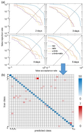 The accuracy of our discriminant classifiers was evaluated based on closed-set identification, allowing a given observation to be assigned to the class with the largest latent variable or best posterior probability to distinguish one from the others. Thus, this can cause errors of assigning a class that provides the highest probability score for unregistered users. However, in biometrics, if the acquired feature vector does not provide a sufficiently large posterior probability, the algorithm must be able to recognize an unregistered user and reject the case. Using the threshold of the latent variables of the classifier, the measured data were allowed to be assigned to the classes only if the posterior probability of the data was greater than the threshold. This method enables recognizing an unknown user who was not enrolled in training process. By changing the threshold in the CNN model that yielded the highest accuracy, we evaluated the sensitivity (1—false acceptance rate, FAR) and specificity (1—false rejection rate, FRR) for the receiver operating characteristic (ROC) curve. The ROC curves of the classification results based on the number of measurement days (2, 3, 4, and 5) for each feature selection in the CNN model are shown in Figure 7. The horizontal axis represents the false acceptance rate, and the vertical axis represents the false rejection rate, in which the more adjacent to the lower left corner the curve is, the better the performance is. In the case of a dataset with a small number of measurement days, such as 2 or 3 days, the ROC curve of the upper limb feature was significantly better than that of the ratiometric feature. As the number of measurement days increased, the ROC curve of the ratiometric feature improved. Additionally, using both upper limb and ratiometric features substantially improved performance, as shown in the ROC curves for all cases. The ROC curve was used to evaluate the area under the ROC curve (AUC) and an equal error rate (EER) at which FAR was equal to FRR. In the case of datasets of 5 days, the upper limb feature reduced the classification error rate from 22.38% to 4.3% compared to the finger impedance (raw data), and further reduced it to 2.4% by combining it with the ratiometric feature, resulting in an AUC of 0.9999 and an EER of 0.49%. Figure 7b shows a confusion matrix of 33 subjects using both upper limb and ratiometric features in CNN for the dataset of 5 days. The intensity of the color of the blue box represents an accurate prediction, and that of the red box represents a false prediction. ‘S1, S2, S3, ⋯ S33′ represents each subject class. Most of the predictions are located in the blue-colored diagonal matrix.
