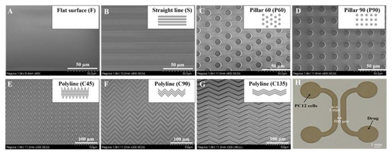 SEM images of PDMS replicas with different topological microstructures and images of the upper layer with the symmetric cell culture channels. (A) flat surface (F). (B) straight channel (S). (C) 60° distribution micropillar array (P60). (D) 90° distribution micropillar array (P90). (E) 45° polyline (C45). (F) 90° polyline (C90). (G) 135° polyline (C135). Scale bar = 50 µm or 100 µm. (H) Images of the upper layer mold with the symmetric cell culture channels. Scale bar = 1 mm.