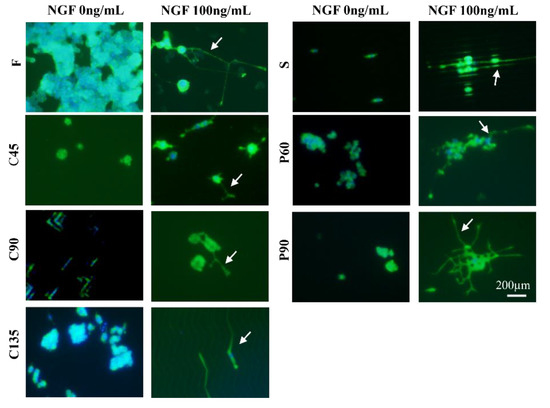Fluorescence images of F-actin expression of PC12 cells under different conditions. Green, F-actin; blue, cell nucleus; NGF:100 ng/mL; Scale bar = 200 µm.
