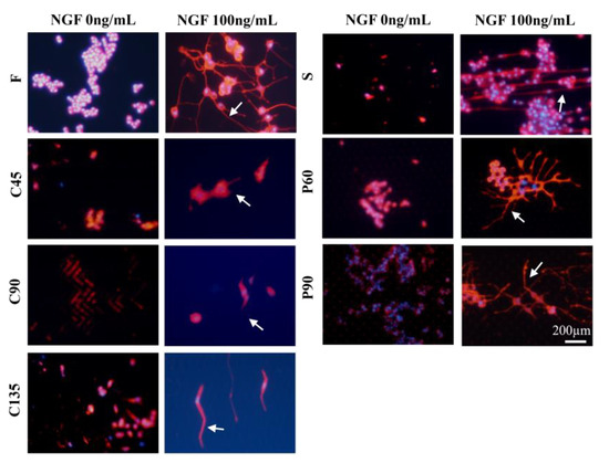 We separated total RNA from the F group, S group, and P 90 group of PC12 after treated NGF 5 days with TRIzol® reagent according to the manufacturer’s instructions (Invitrogen). We used a One-Step RT-qPCR Kit (Sangon Biotech, Shanghai, China) to perform cDNA synthesis and PCR reaction on total RNA and used Lightcycle 96 (Roche, Basel, Switzerland) for detection. Average CT values were normalized to GAPDH expression levels. Primers synthesized by Sangon Biotech (Shanghai) Co., Ltd. were as follows: