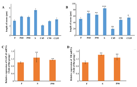 To further prove the relationship between microstructural cues and PC12 neural differentiation, the expressions of growth cone marker GAP-43 and sympathetic marker TH were used to identify the sympathetic characteristics of NGF-treated PC12 cells in different topographies, similar to previous work by Li-Ying Zhong et al. [32]. According to the previous experimental results, we chose the anisotropic topography S and the isotropic topography P90. The results were shown in Figure 4C,D. Compared with the control group (F group), the mRNA expression of the GAP-43 gene and TH gene in S and P90 topographies were significantly increased (p < 0.01), and the increase in S topography was more significant. This indicated that some special microstructure cues could guide neurons to grow in microenvironments of different terrain, size, and structural complexity, and specific three-dimensional constraints can effectively guide the extension of axons.